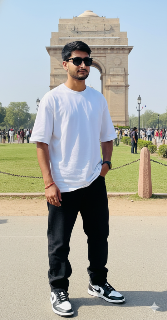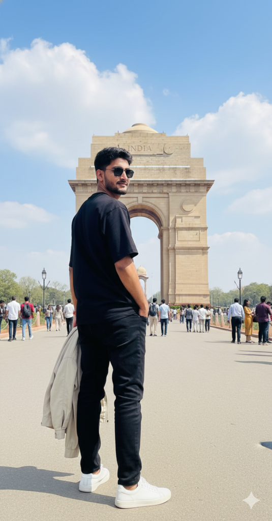 A young man (from uploaded image) stands facing away from the camera, looking in camera and the India Gate in Delhi. He has same dark hair, waering sunglasses a black oversized t-shirt,a Black baggy jeans, and white sneakers. She carries a light jacket over her arm. The monumental India Gate, a sandstone arch with the word 'INDIA' inscribed at the top, dominates the background. The sky is bright and partly cloudy. Numerous people are visible in the distance around the monument, Use my same face 100% other pose