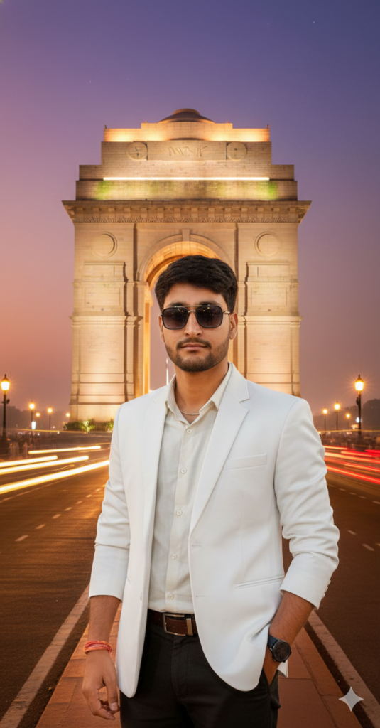 A cinematic portrait of a man near India Gate at twilight, the towering arch rising behind him against a dusky purple sky. Streetlamps flicker on one by one, their glow reflecting off the pavement. Wearing trendy sunglass, He stands in semi-formal attire—white blazer over shirt—his expression steady yet reflective. Motion blur from passing traffic creates glowing streaks of red and yellow light in the distance, framing him in contrast with the still monument. Use my same face 100% change clothes