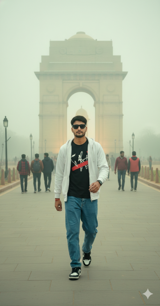 A full-body realistic portrait of a man walking confidently in the center of a wide walkway leading to the cartoon India Gate in New Delhi. He is wearing white hoodie, black graphic tshirt, blue beggy jeans nike air jorden shoes and black sunglass. The scene is set during a cold, foggy morning with a dense, atmospheric mist partially obscuring the top of the illuminated monument. Soft golden and green lighting glows from the archway. In the background, a few blurred tourists in winter clothing walk by. Use my same face 100% other pose
