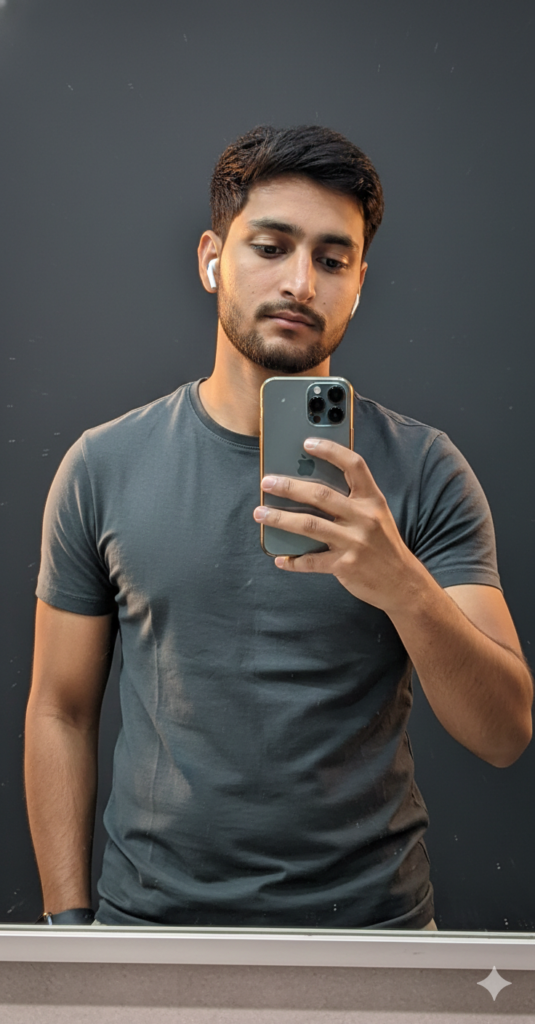 Hyper-realistic mirror selfie of the same person (100% face match) shot on iPhone 17 Pro Max. Natural skin with pores, fine hair, authentic texture, neutral expression, earbuds visible. Wearing fitted cotton T-shirt with real wrinkles and stretch. Metallic phone reflection sharp, golden rim light on dark wall, soft shadows, cinematic warmth, ultra-detailed RAW realism. use my same face 100%