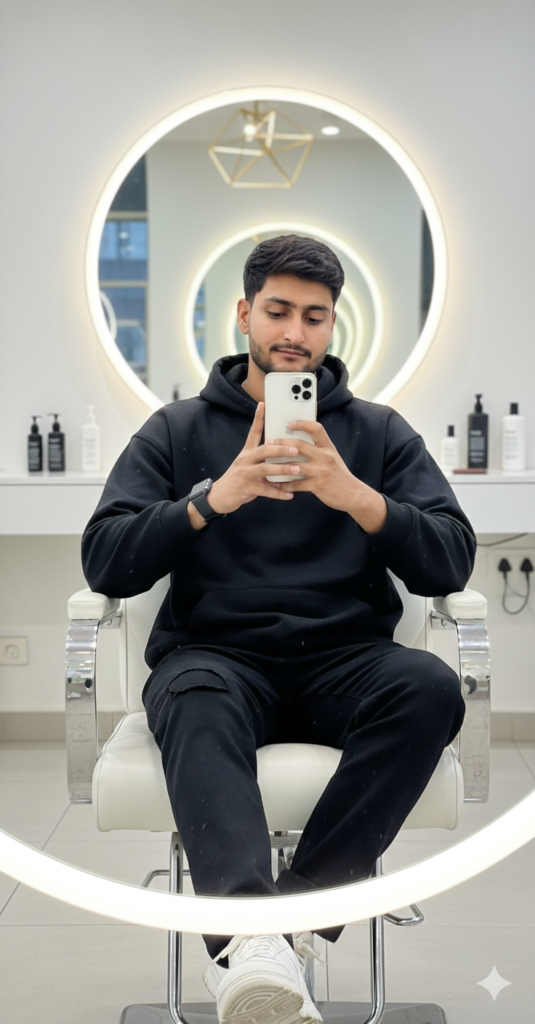 A high-resolution DSLR photograph using a 50mm lens of a handsome Asian man, identical to the provided reference photo, with the same distinct facial features. wear black beggy jeans. He is sitting casually in a modern, brightly lit beauty salon chair with both legs resting comfortably. He is taking a mirror selfie using a sleek white iPhone. He is wearing a relaxed street-style outfit: an oversized use my same face 100%