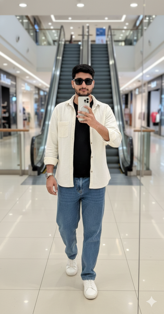 A full-body mirror selfie in a modern shopping mall, the man walking confidently toward the mirror, holding a white iPhone 17 Pro Max in front of his face with one hand, the other hand relaxed down, wearing black sunglasses, a textured off-white overshirt with sleeves rolled up over a black shirt, blue beggy jeans, white sneakers, and a wristwatch, escalator and store background slightly blurred, bright indoor lighting, realistic photography. use my same face 100%