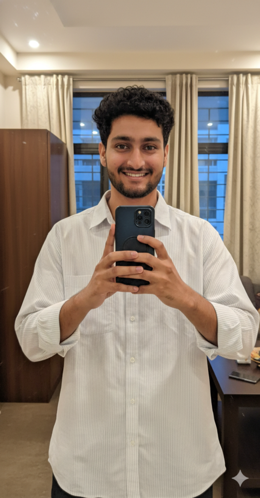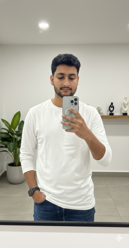 ultra-high-definition 8K candid mirror selfie of the same person from the reference image, preserving the exact face identity with 100% accuracy. Do not modify eyes, nose, lips, cheeks, jawline, skin tone, or facial proportions in any way. The person is wearing a crisp white full-sleeve t-shirt and standing naturally in a modern, softly lit room with a clean, minimal aesthetic, holding an iPhone 17 Pro in one hand at a slight angle to capture a realistic reflection.use my same face 100%