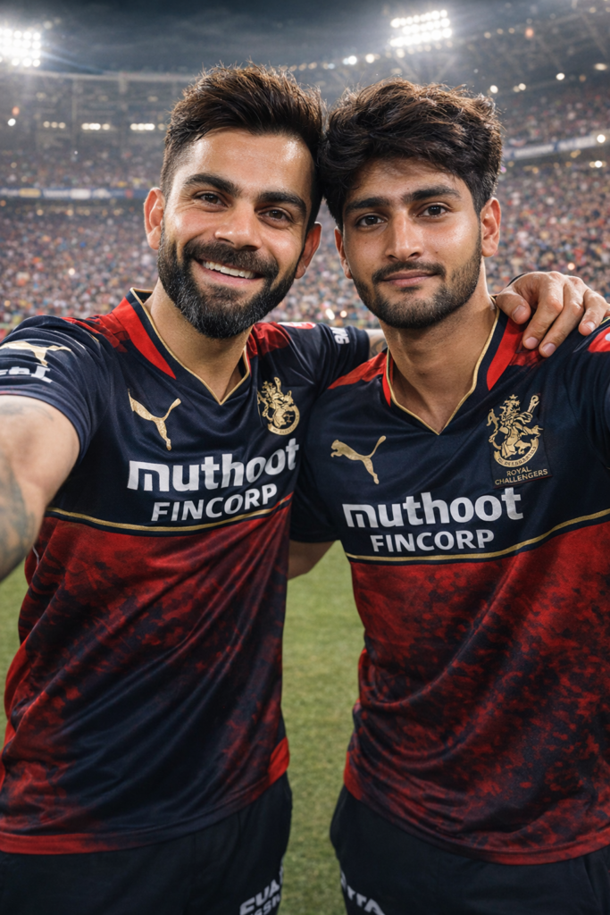 Craete A 9.16 ratio, ULTRA-REALISTIC 8K PORTRAIT of a young man wearing RCB jersey(use uploaded photo for 100% exact face & messy voluminous wavy brown hair match) taking a selfie with virat kholi, both wearing same RCB jerseys. The scene is set inside the cricket stadium, filled with bright floodlights and an excited crowd. Capture natural expressions, lifelike skin texture, sharp facial details, and accurate jersey colors/logos. The atmosphere should feel like a real match day. And for boy use my same face 100%
