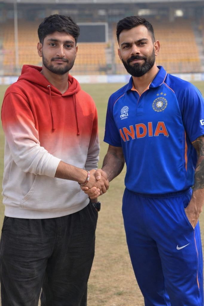Craete A 9.16 ratio, Create a highly realistic photo of me standing side by handshake with Virat kohli and me wearing red and white gradient hoodie and black linen beggy pants. Make it look like we are casually meeting at an stadium ground and Virat kohli wearing INDIA Blue jersey, both very confident and looking at the camera. Ensure natural lighting, sharp details, and a seamless blend so it looks like a genuine candid photograph." My face 100% same.slightly messy dark hair black. And for boy use my same face 100%