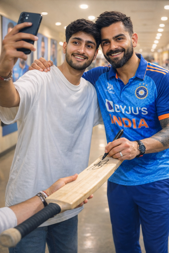 Craete A 9.16 ratio, A young cricket fan excitedly takes a autograph on bat by Virat Kohli in a brightly lit stadium hallway. Both are smiling warmly, showing genuine happiness. The fan wears a oversized white t-shirt and holds his phone up for the selfie, while Virat Kohli, dressed in a blue india jersey, stands beside him with a friendly arm around the fan’s shoulder. The background features blurred portraits of cricket players on the wall, and the atmosphere is full of admiration, joy, and respect. And for boy use my same face 100%