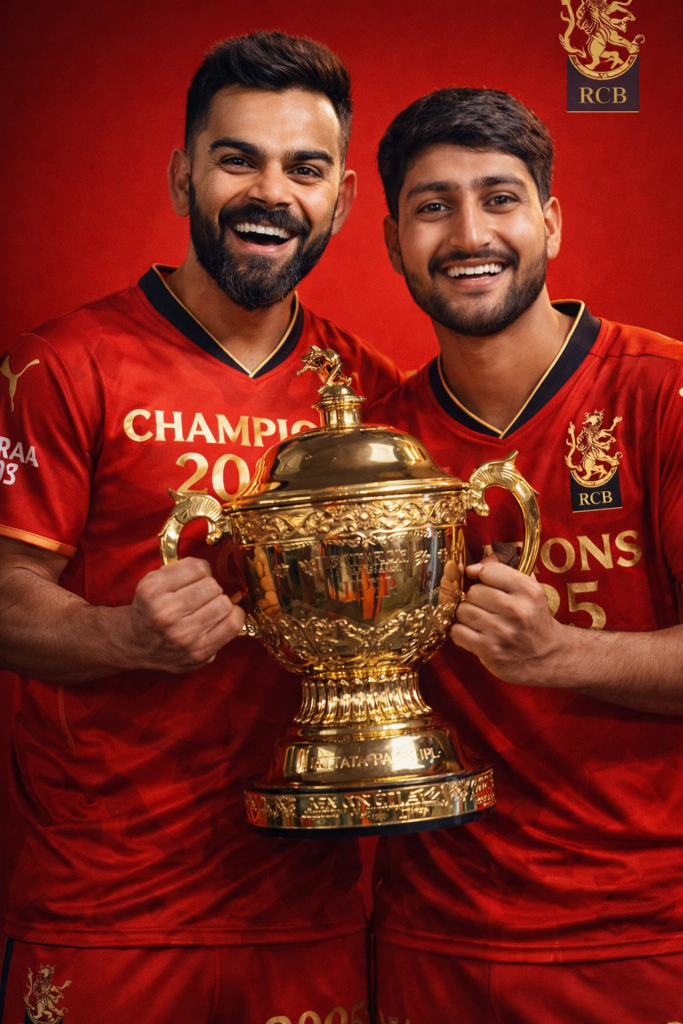 Craete A 9.16 ratio, Ultra-realistic 8K cinematic IPL celebration photo. Replace one RCB teammate with the uploaded face (same skin tone, facial details). Keep Virat Kohli in the center, both wearing red “Champions 2025” RCB jerseys, holding the golden IPL trophy with big smiles. Background: solid red and RCB logo (top right). Sharp lighting, detailed skin, trophy reflections, hyper-real sports vibe. And for boy use my same face 100%