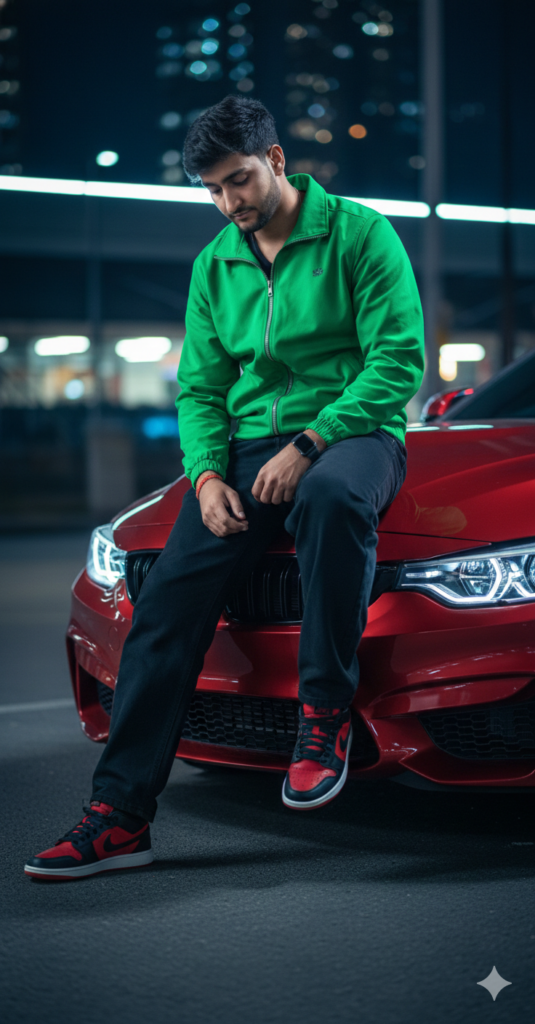 ULTRA-REALISTIC 8K PORTRAIT of a stylish young man. A stylish young man sitting casually on the hood of a bright neon dark red BMW sports car bonnet. His left leg is bent and resting on the car, while his right leg is dropped down towards the ground. He is looking down at his casual in a relaxed position. The man is wearing a Green jacket and black beggy jeans. and red black nike sneakers."Use my same face 100%