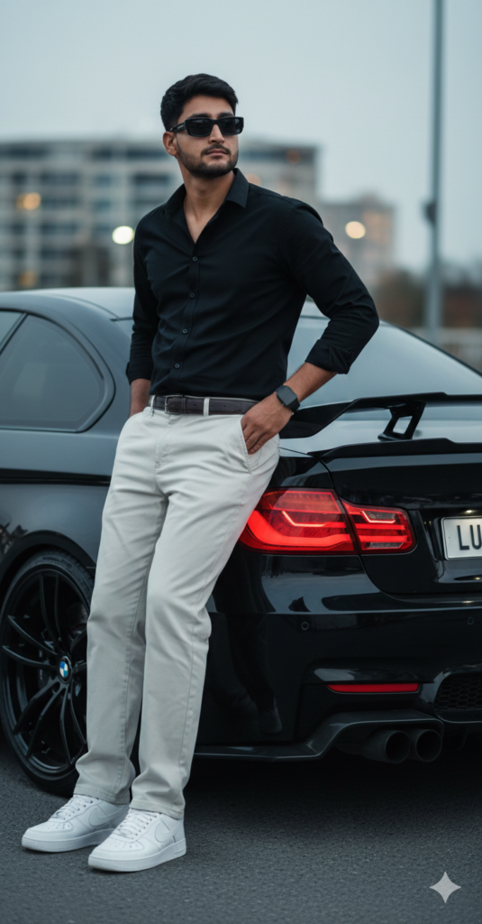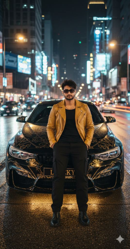 A 25-year-old man leaning on a fully modified black BMW, demon headlights ON, five-spoke alloy wheels, racing spoiler.