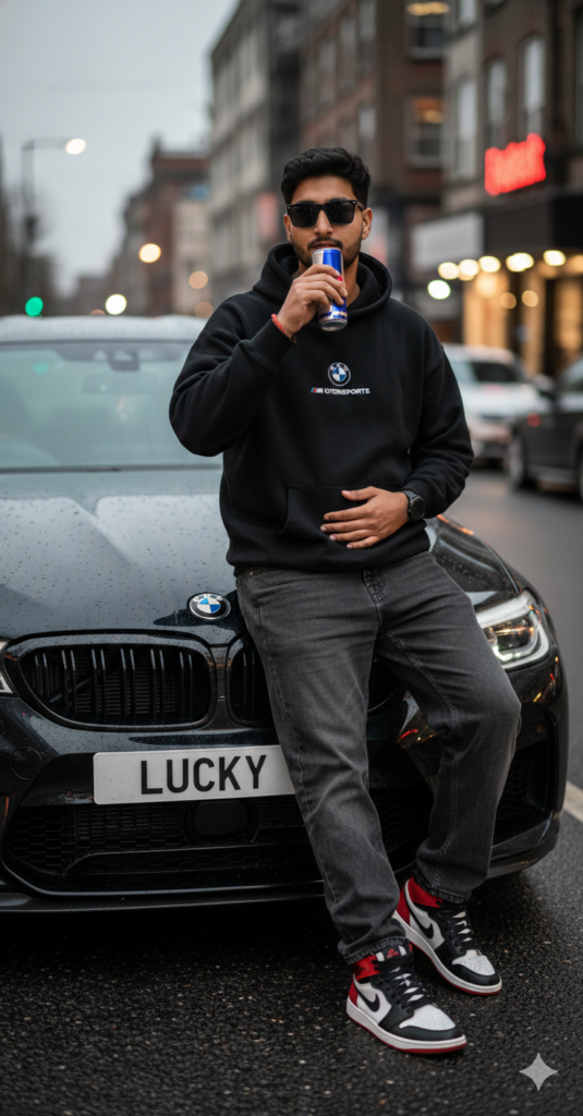 Ultra-realistic 8K photo of a young South Asian man with a short groomed beard and textured dark hair, wearing black sunglasses. He is leaning casually near the hood of a sleek black metallic BMW M5 Competition number plate LUCKY. He is wearing a black oversized hoodie with a small BMW logo on the chest and "MOTORSPORTS" text, baggy grey-black jeans, and nike air jorden sneakers. His right hand holds a Red Bull can, and his left hand rests on his stomach.