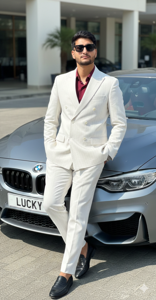 A photorealistic, high-angle full-body shot of a young man leaning casually against the front bumper of a grey BMW M4 Competition and number plate LUCKY. The subject is wearing a stylish white double-breasted pinstripe suit over a deep maroon open-collar dress shirt, accessorized with He is wearing thick black designer sunglasses, and black loafers. He has his legs crossed at the ankles and exudes a confident, wealthy attitude. Use my same face 100%