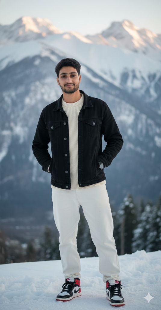 A hyper-realistic, 8k cinematic Create an ultra realistic of a 20 year old young boy (from the uploded image). He is casually standing against a Kashmir's beautiful Mountains covered with snow. He wears a black denim jacket over a cream sweater, both hands in the jacket's pocket, White beggy jeans, Nike air jorden sneakers. And wearing sunglasses. Confidentially looking at the camera with soft smile, Captured in long angle camera. use my same face 100%