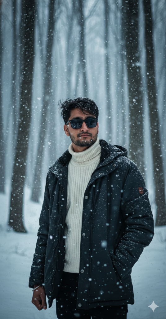 8k Hyper-realistic like DSLR, Half-body portrait of a young man (from uploaded images) with dark messy hair over the eye and sunglasses, standing in a heavy shower of falling snow in a winter forest. He wears a dark jacket over a cream turtleneck. The image is dynamic and high-contrast, capturing motion and cold atmosphere. use my same face 100%