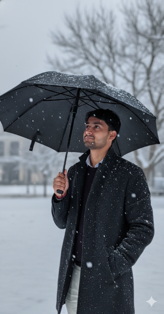 A candid shot from a slightly low angle, showing the man looking upwards towards the falling snow. His head is slightly tilted, and he holds the umbrella. Snow is visible on his coat and the black umbrella. The lighting emphasizes the textures of the wool and the falling flakes. The background is a blurred, muted winter landscape with trees. use my same face 100%
