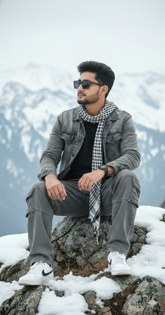 A hyper-realistic, 8k cinematic shot of a stylish young man sitting on a jagged, snow-dusted rock in a majestic winter mountain landscape. He has voluminous dark hair styled upward and a light beard, wearing matte sunglasses and looking off to the side with a contemplative expression. He is dressed in a grey denim jacket, a black t-shirt, gray beggy cargo jeans, and white black nike sneakers. A black and white checkered scarf is wrapped loosely around his neck. The background features a soft-focus. use my same face 100%