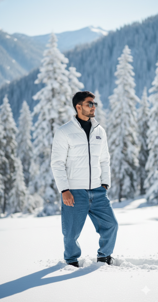 Create A 8K Full-body photo of a stylish young man (from uploaded images) in a white puffer jacket and blue beggy jeans standing in deep snow on a sunny winter day. He wears sunglasses and looks away from the camera. The background is a snowy mountain forest with tall pine trees and blurred background, featuring bright, natural light and a crisp atmosphere. use my same face 100%