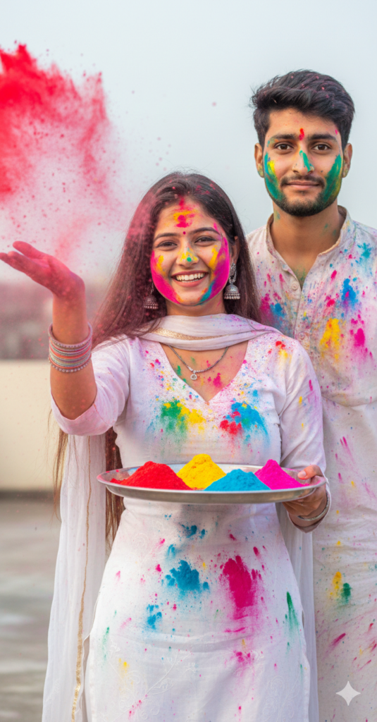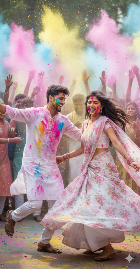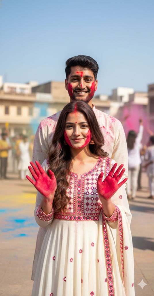 Google Gemini Cinematic Holi Couple Prompts Realistic AI-generated festive portraits 2026
