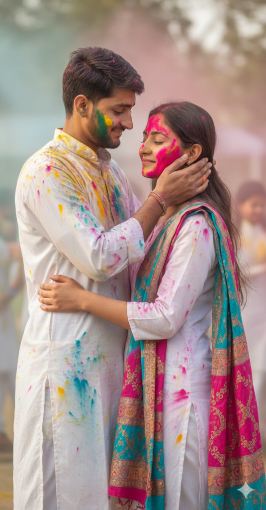Holi Couples prompt celebrating Holi, the festival of colors. The man is embracing the woman from behind, with his hand gently touching her face, which is smeared with pink and red Holi powder.Both are dressed in white outfits that are also stained with colorful powders. The woman has a colorful dupatta draped over her shoulder, adding to the festive look. Her eyes are closed, and she has a gentle smile, while the man is looking front at her with affection. For the men Use my same face 100%