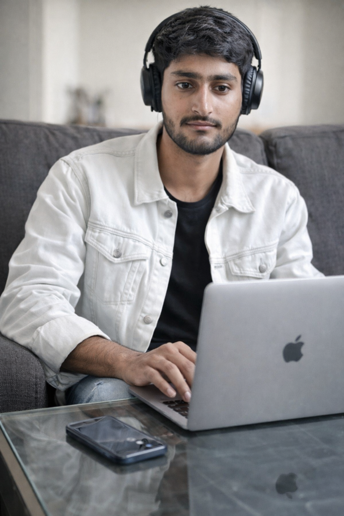 Use my face and create a pic a young man 18 years old wearing white denim jacket over black t_shirt with same hair and same beard leaning on sofa and glass table infront of him and also mobile phone on glass table and he is using apple leptop and also he wear headphone High realistic pic 8k quality. And for boy use my same face 100%
