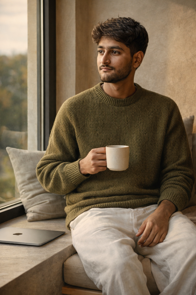 cinematic editorial portrait of a man sitting by a large window, holding a ceramic mug and gazing thoughtfully outside. He has tousled brown hair and a contemplative expression, dressed in a textured olive green knit sweater and loose white linen trousers. A sleek Apple laptop rests beside him on the stone window ledge with soft fabric accents and neutral cushions. Warm natural daylight filters in, casting golden highlights and soft shadows across the textured plaster wall and minimal modern interior And for boy use my same face 100%