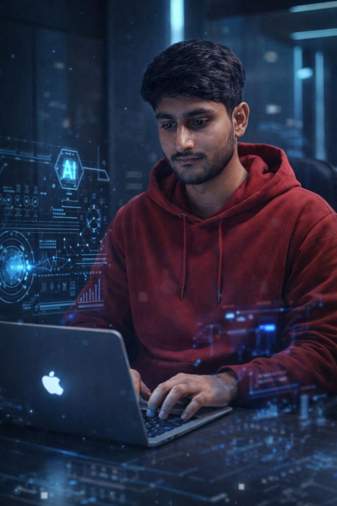 Generate a realistic image of a young man (uploaded image as reference) sitting in a minimalistic room, typing into a Apple laptop with glowing AI interface around him, introverted expression, red hoodie, futuristic room interior, mid-shot, cinematic lighting, tech-inspired art style. And for boy use my same face 100%