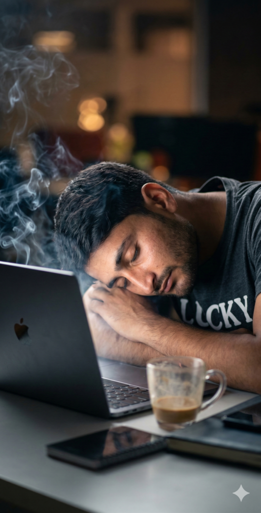 Create an image using the attached image (no edit) He is wearing a green Tshirt with a print LUCKY. A tired fast asleep on the table with his apple open laptop, show the laptop light filling the dim room Make it more realistic . Shot from a dramatic side angle; crisp facial detail with swirling light in cinematic depth; soft white highlights, gentle fill from light bounce. And for boy use my same face 100%