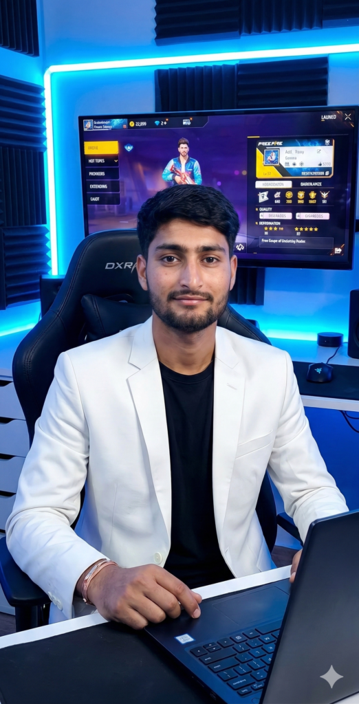 Photo-realistic 8K half-body portrait of the person in the uploaded image, A young man with dark hair and a neat beard, wearing a White blazer over a Black t-shirt, sitting at a desk with a laptop open in front of him. He is looking directly at the camera. In the background, there's a computer monitor displaying a FREE FIRE GAME , and blue LED lights illuminate the gaming setup. He is sitting in a black gaming chair. The overall atmosphere is modern. And for boy use my same face 100%