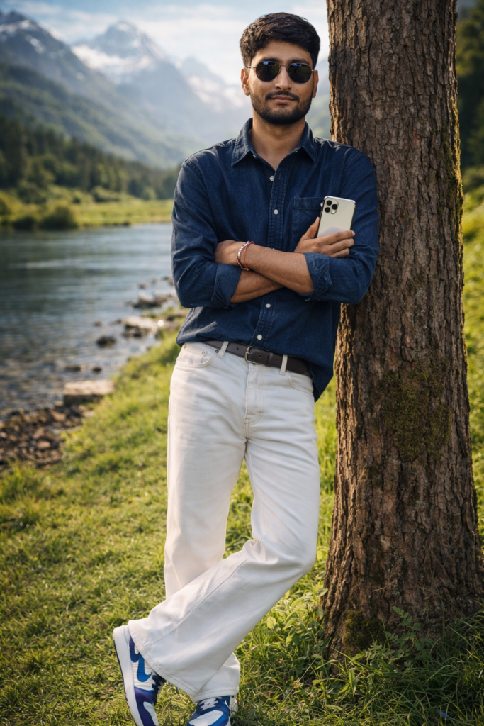 Create a 9.16 portrait Ultra-realistic 8K DSLR photo of a stylish young man leaning against a tree by the river, mountains and vibrant green grass in the background. Wearing white bootcut jeans, dark blue denim shirt, nike sneakers, and black round sunglasses. Arms crossed, confident gaze at the camera and holding Iphone 17 pro max in one hand. Face matches uploaded reference image. Cinematic, full-color, hyper-realistic, vivid, saturated colors, fashion photography, dramatic sunlight. And for boy use my same face 100%