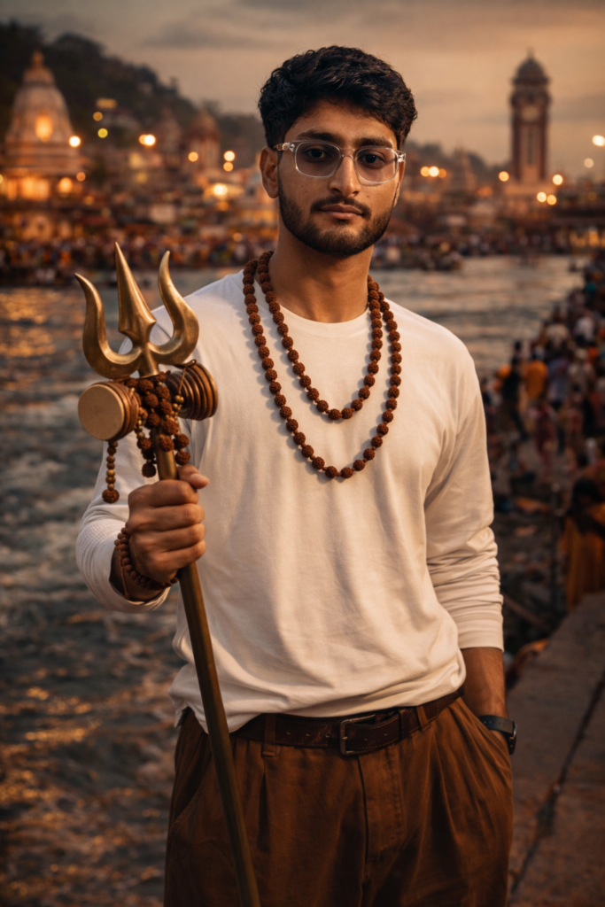 Create a 9.16 portrait 8K ultra-realistic cinematic portrait of a young South Asian man with wavy dark hair and a groomed beard, wearing clear transparent sunglasses rudraksh mala, white full-sleeve t-shirt and brown beggy pants, standing confidently at Haridwar Ganga Ghat, holding a trishul with damru and rudraksha. Flowing Ganga river, crowded ghats and temples in background, evening spiritual vibe, warm tones, shallow depth of field, cinematic lighting, DSLR photo look, devotional Shivratri aesthetic. And for boy use my same face 100%