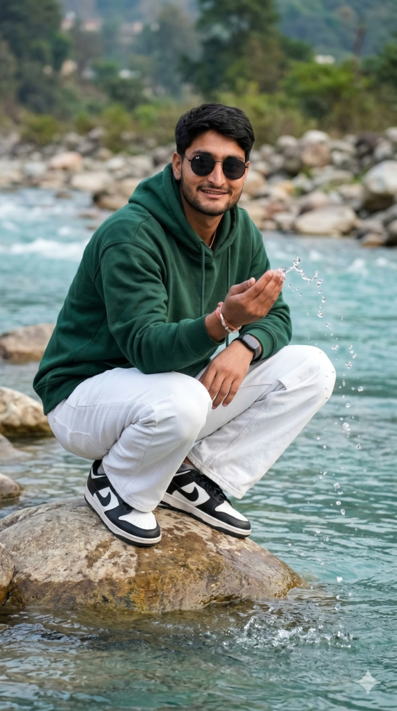Create a 9.16 portrait A young man crouching on a rock beside a flowing river, gently splashing water with his hand. He is wearing a dark green oversized hoodie, white beggy jeans, and black and white nike shoes and wearing black round sunglass with metal frame. Clear turquoise water splashes into droplets around his hand, captured sharply in mid-air. Natural outdoor setting with scattered rocks, soft greenery in the background, and a calm, peaceful atmosphere. Soft natural lighting, crisp details,relaxing nature vibe, realistic photography. And for boy use my same face 100%