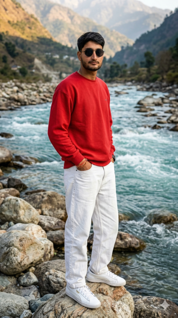 Create a 9.16 portrait 8k ultra-realistic cinematic portrait of a young stylish man stand casually on large river rocks beside a fast-flowing turquoise river in a scenic mountain valley. His face and hairstyle exactly match the uploaded reference image, hairstule perfectly set, slightly facing the camera. He wears a textured Red long-sleeve crew-neck oversized sweatwear. white textured beggy jeans and black round sunglass with metal frame, and classic white lace-up Puma sneakers. And for boy use my same face 100%