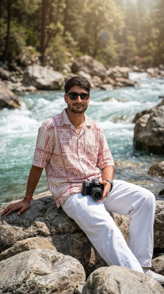 Create a 9.16 portrait 16K ultra-realistic cinematic portrait of a 20 year thin and skinny body sitting on large river rocks beside a fast-flowing turquoise mountain river. His face and hairstyle exactly match the reference image, hair perfectly styled. He looks at the camera with a calm, confident slight smile and weraing black matte sunglass. He leans back with one hand on the rock, holding a DSLR in the other. He wears an oversized short-sleeve button-up shirt with a white-red colour, white beggy jeans. And for boy use my same face 100%