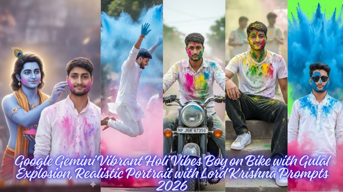 Google Gemini Vibrant Holi Vibes Boy on Bike with Gulal Explosion, Realistic Portrait with Lord Krishna Prompts 2026