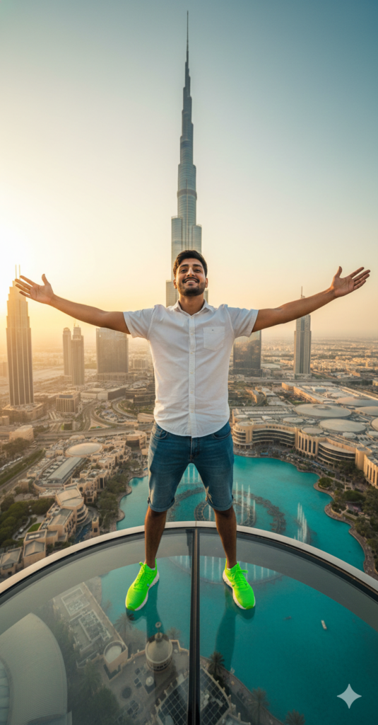 A wide-angle, high-atitude POV shot of a man standing on the very edge of a circular glass skyscraper rooftop in Dubai. He is wearing a white short-sleeved shirt, blue denim shorts, and bright neon green sneakers, with his arms wide open in a celebratory pose. In the background, the iconic Burj Khalifa towers over the city skyline during a golden hour sunset. Below him, the Dubai Mall and turquoise fountains are visible. use my same face 100%