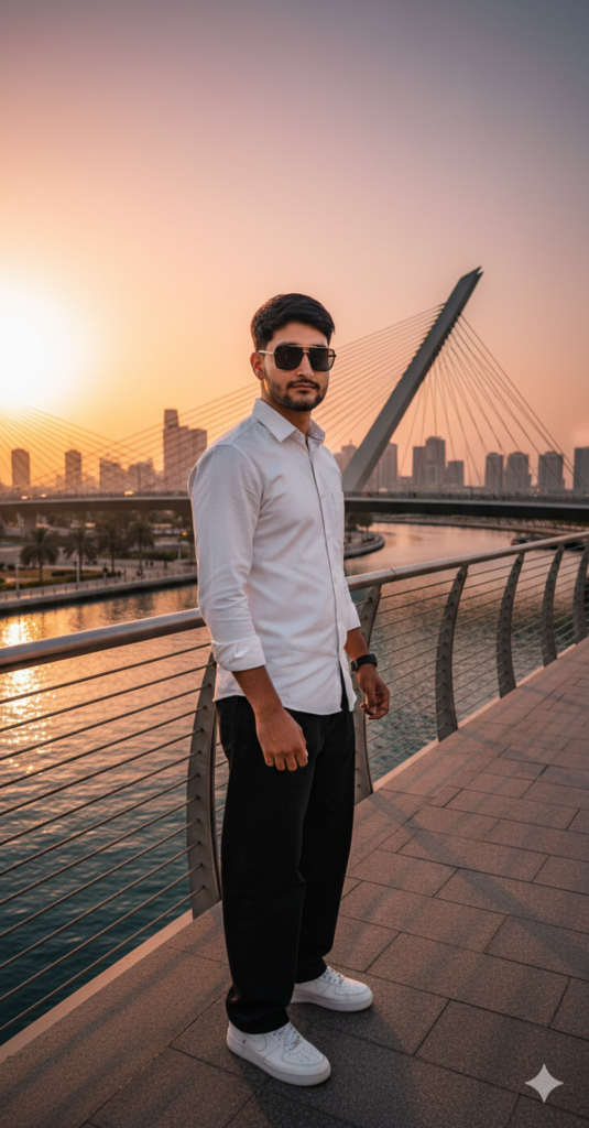 Ultra realistic ultimate enhanced hyper-realistic 8K full-body portrait of the same man (exact face & hairstyle), standing confidently on Meydan Bridge side pose, Dubai during golden hour. Wearing a white fitted shirt, black beggy jeans , and white nike sneakers with sunglasses. Soft sunset glow, warm tones, cinematic lighting, detailed reflectionsultimate enhanced hyper-realistic. use my same face 100%