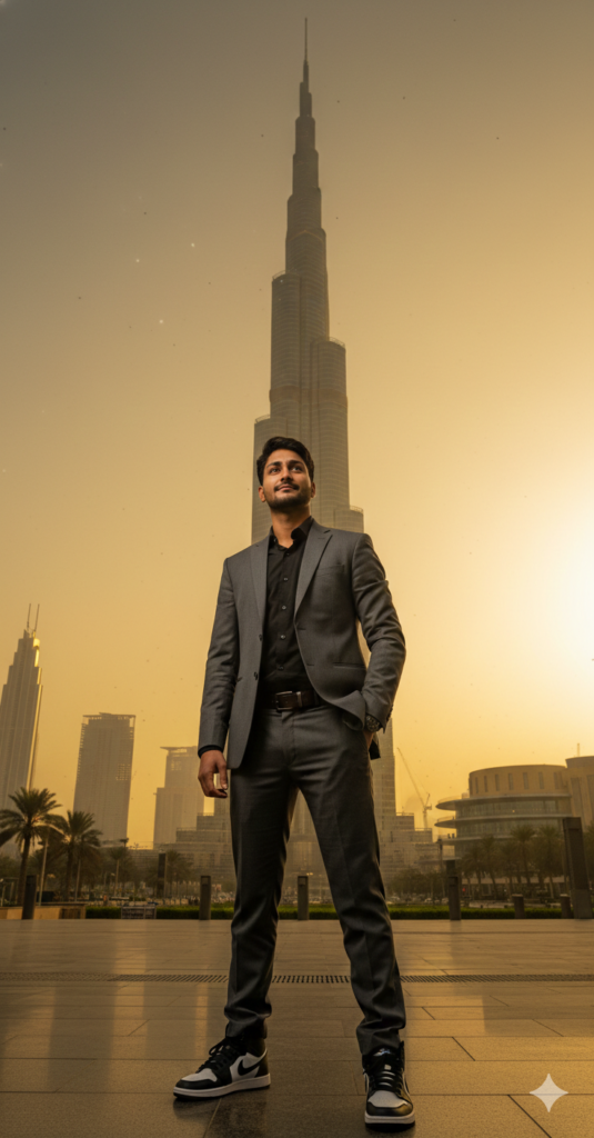 4k ultra hd realistic full body portrait of a young 18 year old man, Standing infront of Burj khalifa Dubai, angle low from down, 12mm Camera angle 9:16 aspect ratio, moody morning style sun golden effect. he's wearing a grey suit black shirt, and black shoes nike jordan high, use my same face 100%