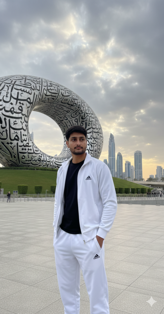 A young man (from uploaded image) in a white branded beggy adidas tracksuit and and black t-shirt stands posing in front of the Museum of the Future in Dubai. The massive, elliptical, metallic structure, covered in Arabic calligraphy, dominates the background. In the distance, other modern skyscrapers are visible under a dramatic, cloudy sky. use my same face 100% other pose