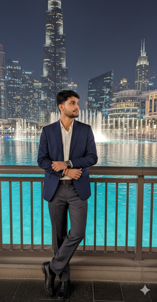 A stylish young man standing on a walkway , night lighting beautiful view overlooking a bright turquoise body of water with a stunning city skyline reflection of lights in the water height of the building. modern skyscrapers, this scene is most likely in Dubai, possibly near the Burj Khalifa and the Dubai Fountain water dance at night view the background on night view. He’s leaning casually against the stone railing, looking to his right with a calm, thoughtful use my same face 100% and change clothes