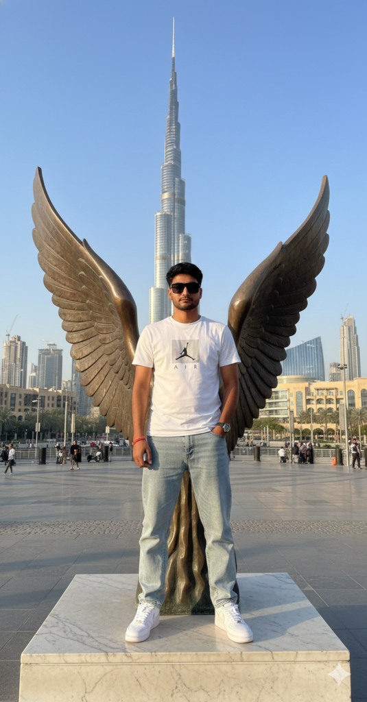 An 8K ultra-realistic, hyper-detailed cinematic portrait of a stylish young man. He is standing confidently on the raised platform of the "Wings of Mexico" sculpture (or a similar large artistic wing installation and in background burj khalifa) in Dubai, perfectly positioned between the majestic, spread-out bronze wings, so they appear to be his own. He is dressed in a modern, wear nike air jorden t-casual outfit, beggy jeans and wear sunglass perhaps a well-fitted white t-shirt,use my same face 100%